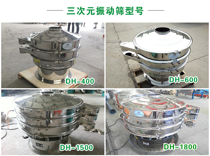 大汉机械所生产的三次元振动筛型号有:DH-400、DH--600、DH--800、DH--1000、DH--1200、DH--1500、DH--1800、DH--2000等等标准型号。