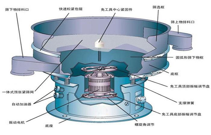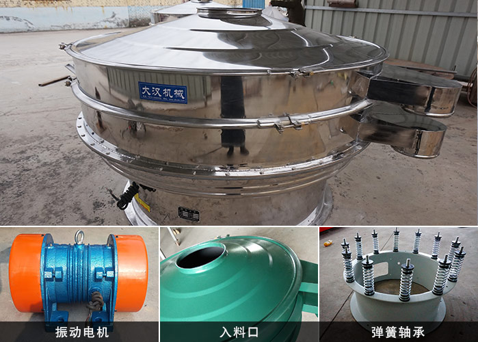 中药粉三次元振动筛主要由进料口、防尘盖、出料口、束环、筛网、配重块、上部重锤、振动体、振动电机、弹簧、下部重锤、机座等部分组成。