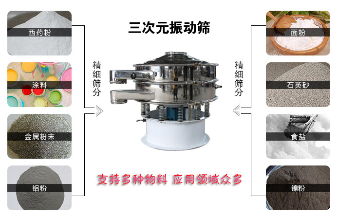中药粉三次元振动筛广泛应用于食品、化工、医药、冶金等行业,任何颗粒、粉末、粘液一定范围内均可筛选。